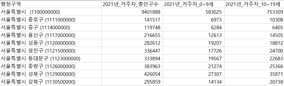 ['행정구역', '2021년_거주자_총인구수', '2021년_거주자_0~9세', '2021년_거주자_10~19세']