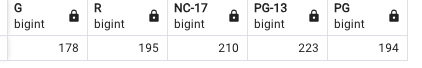 SUM(CASE WHEN rating in ('G') THEN 1 ELSE 0 END) AS "G",